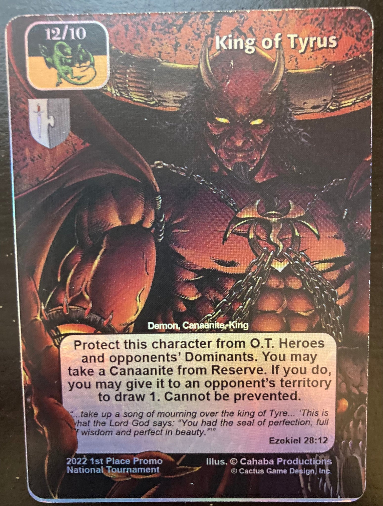 Protect this character from O.T. Heroes and opponents' Dominants. You may take a Canaanite from Reserve. If you do, you may give it to an opponent's territory to draw 1. Cannot be prevented.